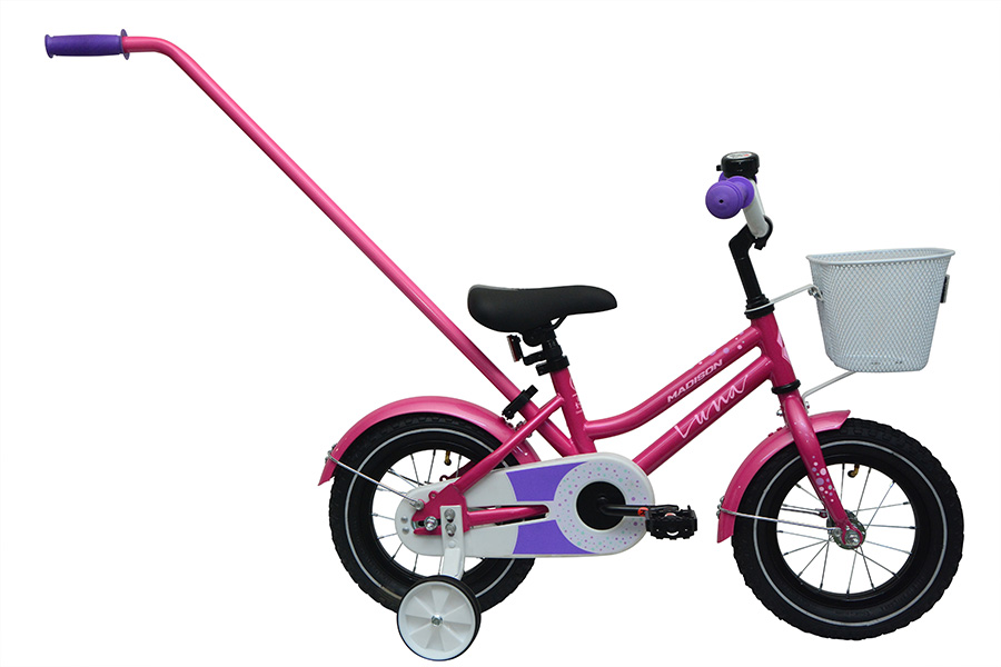 Pyörässä on lokasuojat, työntötanko, apupyörät, etukori, soittokello ja heijastimet vakiovarusteena.